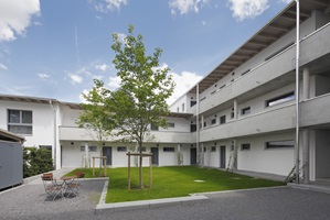 - Umlaufend außenliegende Laubengänge aus Stahlbetonfertigteilen mit schallentkoppelter Auflagerung am Holzbau und Abstützung auf Stahlbetonrundstützen