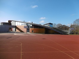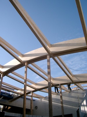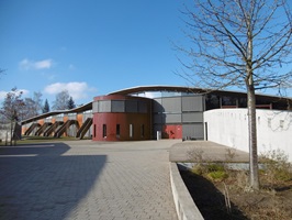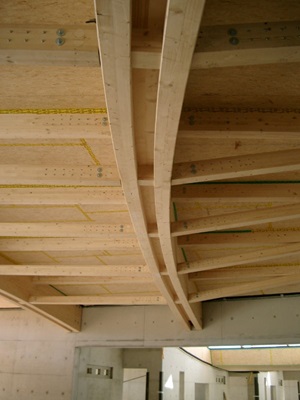 - Räumlich gebogenes BSH-Tragwerk über Aula und Turnhalle