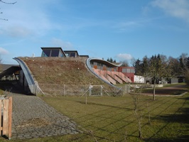- Runder, 2-geschossiger Baukörper (Rotunde), welcher die Außenfassade durchdringt (gebogene BSH-Randträger, Stahlstützen, BSH-Decken mit Rippen, gebogene Außenwände in Holzrahmenbauweise)